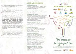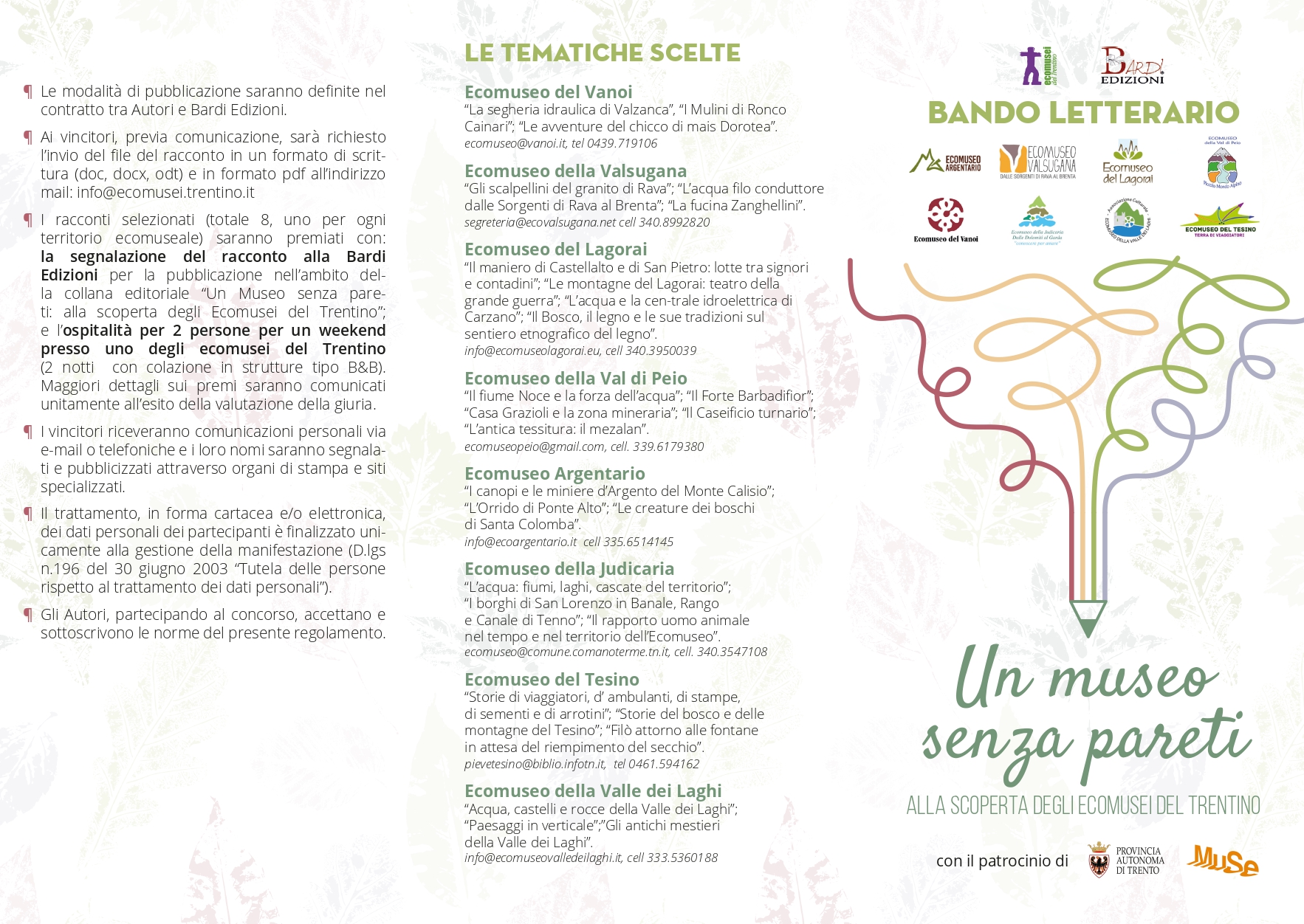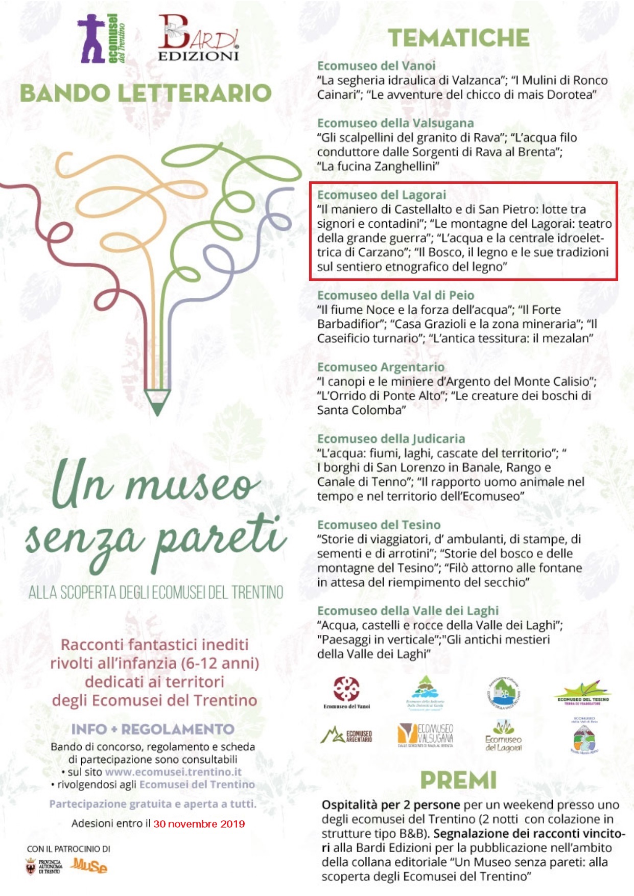 La Rete degli Ecomusei del Trentino, con il patrocinio della Provincia Autonoma di Trento – Servizio Attività Culturali, promuove il bando letterario “Un Museo senza pareti: alla scoperta degli Ecomusei del Trentino” in collaborazione Bardi Edizioni di Roma.