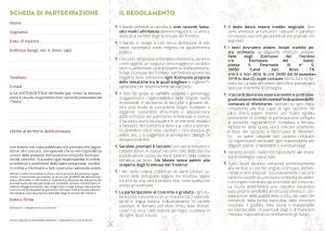 ¶ I racconti dovranno essere anonimi e contrassegnati solamente dal titolo e dall’indicazione dell’Ecomuseo di riferimento riportato su ogni copia. Unitamente alle due copie di ogni racconto nel plico dovrà essere inserita una busta sigillata contenente la scheda di partecipazione (allegata al presente regolamento)* compilata e firmata. All’esterno della busta verrà indicato solamente il titolo del racconto e l’Ecomuseo di riferimento. Le opere cartacee non saranno restituite. Gli organizzatori declinano ogni responsabilità per disguidi postali, smarrimenti o eventuali plagi.