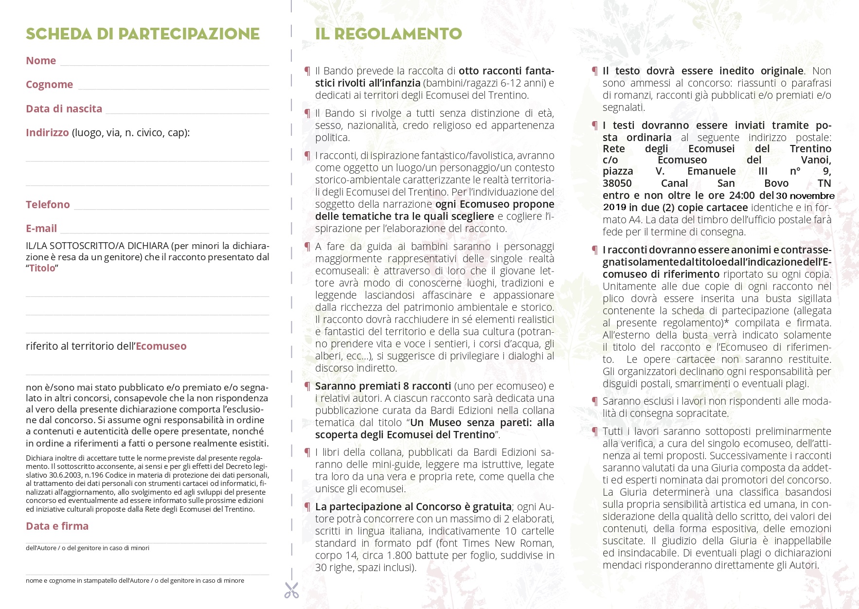 ¶ Il Bando prevede la raccolta di otto racconti fantastici rivolti all’infanzia (bambini/ragazzi 6-12 anni) e dedicati ai territori degli Ecomusei del Trentino.